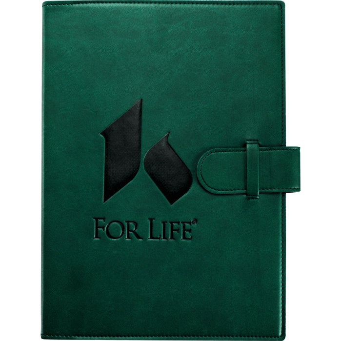 green faux leather refillable journal with tab closure